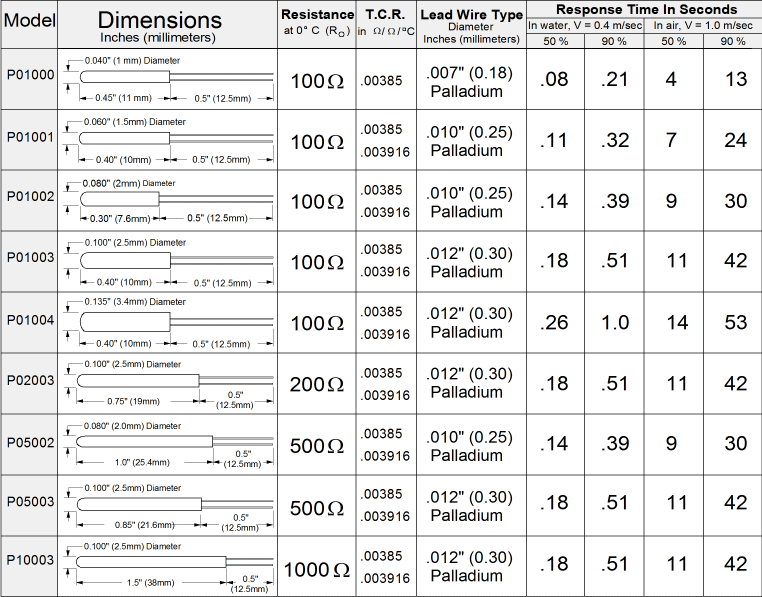 The elements listed below meet the DIN 43760 and IEC 60751 specifications, with the Temperature Coefficient of Resistance (T.C.R.) that is .00385 Ohms/Ohm/Degree C. Model TS1023 does not meet these specifications with a T.C.R. of .00375 Ohms/Ohm/Degree C.