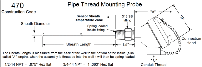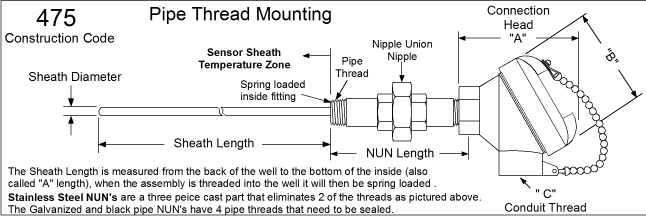 Designed to thread directly into a thermowell with spring-loaded probe to bottom of the well. Connection head added for remote wiring using conduit and a union allows the adjustment of the head to the conduit.